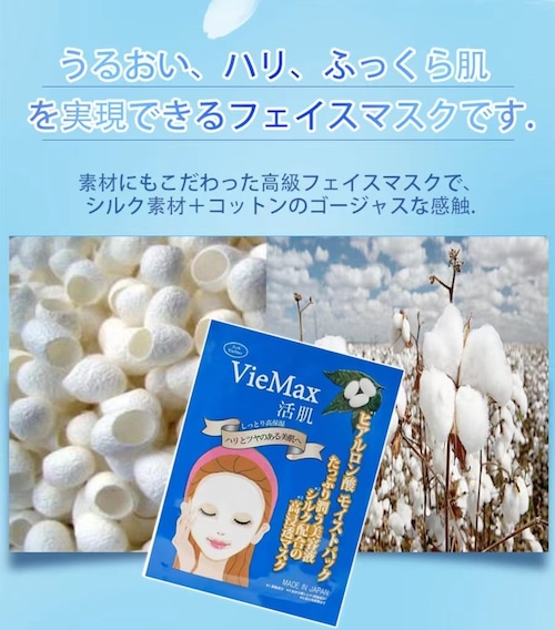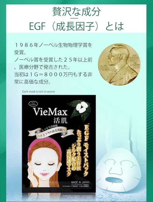 内容量:一张(单个包装)*4张奢侈地配合了丰富的美容成分。是可以实现滋润、紧致、丰满肌肤的面膜。讲究材料的高级面膜,丝绸材质+棉质的华丽触感。提高对皮肤的贴合感和美容液的渗透,保持肌肤的滋润感 ・丝绸精华【水解丝绸】/丝绸丝氨酸(保湿成分)作为含有大量氨基酸的成分,作为美肌效果高的成分被关注。有。丝绸中含有的丝氨酸是皮肤的天然保湿因子(NMF)中重要的保湿成分之一,特别具有出色的保湿效果。・白枫叶提取物(保湿、紧致肌肤成分)、托金仙花精华(保湿、抗炎成分)、莲荠胚芽精华(保湿、紧致肌肤成分)、丝瓜精华(保湿、抗炎成分) ☆胎盘(闪亮肌肤UP+辉肌) ☆翐翑翑的肌肤。☆无香料、无着色 ☆最适合每天的特别护理(洗完澡、睡觉前)。●EGF日本棉+丝绸编织的面膜中含有EGF(保湿成分)美容成分的高级面膜!EGF(人类寡肽1)是上皮细胞增殖因子=促进皮肤细胞生成的成分。用浓稠的精华液滋润肌肤,使肌肤变得细腻。护理10~15分钟,让手吸附,使肌肤变得滋润。在干燥的皮肤上,充满美容液的滋润成分可以完全渗透到皮肤中*。含有大量人类成长所必需的成分,可以改善皮肤的透明感。●胶原蛋白是可以引导肌肤紧致和有弹性的美丽美肌的美肌成分。以有透明感的滋润紧致肌肤为目标,用滋润保护肌肤表面的角质层,引导肌肤弹跳。用有浓稠的美容液滋润肌肤,使肌肤变得细腻。护理5~10分钟,让皮肤变得像吸手一样滋润。在干燥的皮肤上,充满美容液的滋润成分会迅速渗透到皮肤*。含有大量人类成长所需的成分,可以改善皮肤的透明感。●玻尿酸 肌肤的每个角落都给予充足的滋润。会使肌肤变得有弹性、清新。用有浓稠的美容液滋润肌肤,使肌肤变得细腻。护理5~10分钟,让皮肤变得像吸手一样滋润。在干燥的皮肤上,充满美容液的滋润成分可以完全渗透到皮肤中*。含有大量人类成长所需的成分,可以改善皮肤的透明感。●Plancenta 含有大量人类成长所需的成分,改善皮肤的透明感。用浓稠的美容液滋润肌肤,使肌肤变得细腻。经过5~10分钟的护理,让肌肤变得像手吸附一样滋润。在干燥的皮肤上,充满美容液的滋润成分会迅速渗透到皮肤*。含有大量人类成长所需的成分,可以改善皮肤的透明感。【参考】关于胎盘,含有大量皮肤所需的成分,作为消除斑点等的美白效果果、抗衰老成分也备受瞩目。